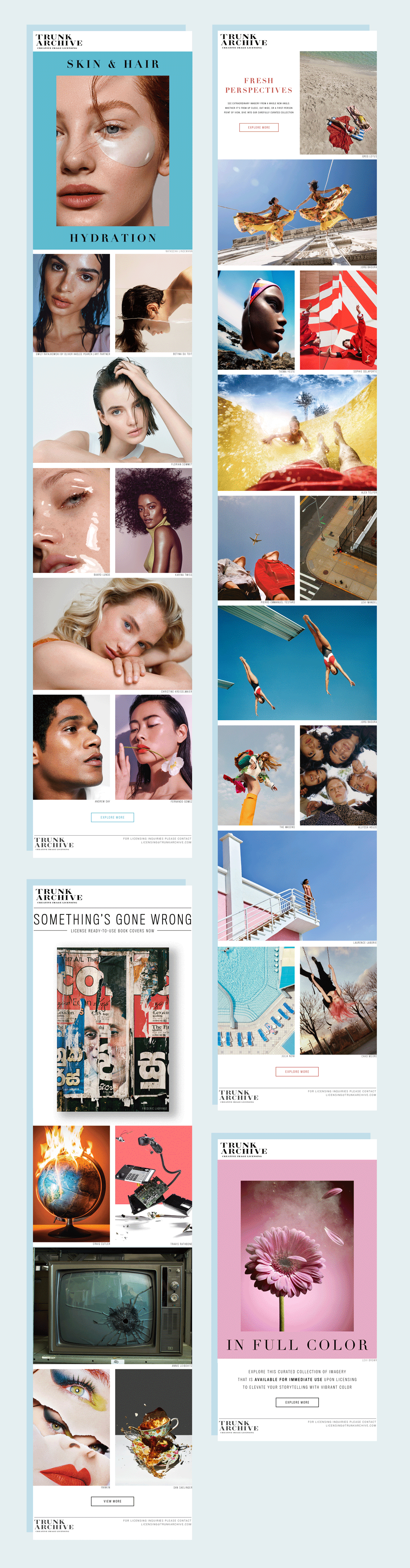 At Trunk Archive, a premiere photo licensing agency, I created everything from email campaigns and social media content to digital ads and print materials. I helped keep our visual branding consistent across platforms, updated the website regularly, and pulled together curated image selections for marketing. These emails present new photographs, current trends, and featured photographers.